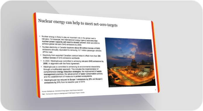 Nuclear energy can help to meet net-zero targets • Nuclear energy is likely to play an important role in the global road to net-zero. For example, the International Energy Agency estimates that nuclear power capacity will need to double between 2020 and 2050 to achieve global net-zero GHG emissions by 2050. • Nuclear electricity in Canada displaces about 50 million tonnes of GHG emissions annually, equivalent to removing 10.7 million passenger vehicles off the road. • Electricity from exported Canadian uranium helps to offset more than 300 million tonnes of GHG emissions worldwide. • In 2022, Westinghouse committed to achieving net-zero GHG emissions by 2050, in alignment with the Paris Agreement. • Westinghouse is committed to enhancing its environmental stewardship through a multifaceted approach. This includes the implementation of comprehensive energy reduction strategies, the improvement of waste management practices, the advancement of water conservation policies, and the establishment of measures to protect ecosystems. • Westinghouse has reduced its Scope 1 emissions by 20% and Scope 2 emissions by 31% from its baseline year of 2019. Sanmen Site, China Photo © Sanmen Nuclear Power Company Ltd. All rights reserved. Sources: Westinghouse, International Energy Agency, World Nuclear Association PwC | The Economic Impact of a Westinghouse AP1000 Reactor Project in Canada 25