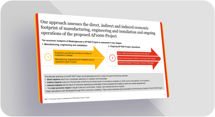 Our approach assesses the direct, indirect and induced economic footprint of manufacturing, engineering and installation and ongoing operations of the proposed AP1000 Project The economic footprint of Westinghouse’s AP1000 Project is assessed in two stages: 1. Manufacturing, engineering and installation 2. Ongoing AP1000 Project operations Over 1,600 direct jobs sustained over the period Expected to provide tens of billions of dollars of investment in Canada Carbon-free energy provided for over three million homes 1 2 Manufacturing, engineering and installation period expected to span 16 years Operational lifespan of the plant: minimum of 60 years The planned spending on the AP1000 Project would generate economic impact through the following channels: • Direct impacts result from companies’ spending on suppliers and employees. • Indirect impacts arise from the activities of the firms providing inputs to a company’s suppliers (in other words, the suppliers of its suppliers). • Induced impacts are the result of consumer spending by employees of the businesses stimulated by direct and indirect expenditures. • The total economic impact is equal to the sum of the direct, indirect, and induced economic impacts. These calculations were developed through PwC’s economic modelling. These values represent gross calculations of the economic footprint of the AP1000 Project. PwC | The Economic Impact of a Westinghouse AP1000 Reactor Project in Canada 15