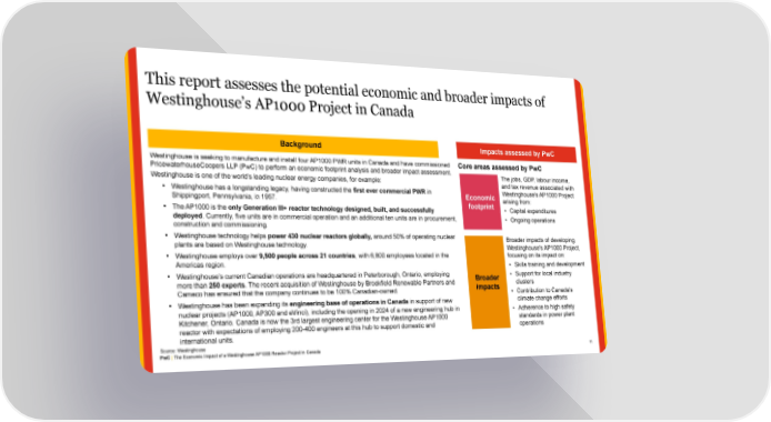 This report assesses the potential economic and broader impacts of Westinghouse’s AP1000 Project in Canada Background Impacts assessed by PwC Westinghouse is seeking to manufacture and install four AP1000 PWR units in Canada and have commissioned Core areas assessed by PwC PricewaterhouseCoopers LLP (PwC) to perform an economic footprint analysis and broader impact assessment. The jobs, GDP, labour income, Westinghouse is one of the world’s leading nuclear energy companies, for example: and tax revenue associated with • Westinghouse has a longstanding legacy, having constructed the first ever commercial PWR in Westinghouse's AP1000 Project Economic Shippingport, Pennsylvania, in 1957. arising from: footprint • Capital expenditures • The AP1000 is the only Generation III+ reactor technology designed, built, and successfully deployed. Currently, five units are in commercial operation and an additional ten units are in procurement, • Ongoing operations construction and commissioning. • Westinghouse technology helps power 430 nuclear reactors globally, around 50% of operating nuclear Broader impacts of developing plants are based on Westinghouse technology. Westinghouse's AP1000 Project, • Westinghouse employs over 9,500 people across 21 countries, with 6,800 employees located in the focusing on its impact on: Americas region. • Skills training and development • Westinghouse’s current Canadian operations are headquartered in Peterborough, Ontario, employing • Support for local industry Broader more than 250 experts. The recent acquisition of Westinghouse by Brookfield Renewable Partners and clusters impacts Cameco has ensured that the company continues to be 100% Canadian-owned. • Contribution to Canada's climate change efforts • Westinghouse has been expanding its engineering base of operations in Canada in support of new nuclear projects (AP1000, AP300 and eVinci), including the opening in 2024 of a new engineering hub in • Adherence to high safety Kitchener, Ontario. Canada is now the 3rd largest engineering center for the Westinghouse AP1000 standards in power plant reactor with expectations of employing 200-400 engineers at this hub to support domestic and operations international units. Source: Westinghouse PwC | The Economic Impact of a Westinghouse AP1000 Reactor Project in Canada 11