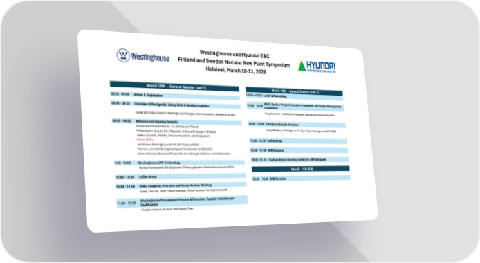 Westinghouse and Hyundai E&C Finland and Sweden Nuclear New Plant Symposium Helsinki, March 10 - 11, 2026 March 10th - General Session (part1) 08:30 - 09:00 Arrival & Registration 09:00 - 09:05 Overview of the Agenda, Safety Brief & Meeting Logistics moderator: Johan Lövqvist, Westinghouse Manager, Communications, Sweden & Finland 09:05 - 09:35 Welcome and Opening Remarks Ambassador Howard Brodie, U.S. Embassy in Finland Ambassador Jung - ha Kim, Republic of Korea Embassy in Finland Jaakko Louvanto, Ministry of Economic affairs and Employment Fortum (TBC) Joel Eacker, Westinghouse Sr VP, APX Projects EMEA Han - woo Lee, Hyundai Engineering and Construction (HDEC) CEO Jarmo Heinonen, Business Finland, Director Strategic Initiatives and Collaboration 9:35 - 10:00 Westinghouse APX Technology Roman Romanowski, Westinghouse VP Energy Systems Market Development EMEA 10:00 - 10:30 Coffee Break 10:30 - 11:00 HDEC Corporate Overview and Nordic Nuclear Strategy Chang - Hee Yun - HDEC Senior Manager, Global Business Development Lead 11:00 - 12:30 Westinghouse Procurement Process & Execution, Supplier Selection and Qualification Frédéric Lafosse, Director APX Supply Chain March 10th - General Session (Part 2) 12:30 - 13:30 Lunch & Networking 13:30 - 14:30 HDEC Nuclear Project Execution Framework and Project Management Capabilities Yong - Seok Kim - HDEC Senior Manager, Nuclear Business Development 14:30 - 15:00 A Project Lifecycle Overview Cheryl Whilhour , Westinghouse Sr Mgr , Project Management APX EMEA 15.00 - 15.30 Coffee Break 15:30 - 17:30 B2B Sessions 18.00 - 21.00 Cocktail dinner (standing buffet) for all Participants March 11th B2B 08:00 - 12.00 B2B Sessions