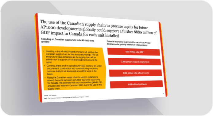 The use of the Canadian supply chain to procure inputs for future AP1000 developments globally could support a further $880 million of GDP impact in Canada for each unit installed Spending on Canadian suppliers to build AP1000 units Potential economic footprint of future AP1000 Project globally developments globally on the Canadian economy $880 million total GDP • Investing in the AP1000 Project in Ontario will build up the Canadian supply chain for this reactor technology. This will bring future value to Canada as the supply chain will be called upon to support AP1000 developments around the 3,900 person-years of employment world. • Currently, there are five operating AP1000 reactors, ten under procurement, construction and commissioning and many more are likely to be developed around the world in the $480 million total labour income future. • Using the Canadian supply chain to support installations around the world will open up further economic opportunity for Canada. We estimate that each unit installed globally can provide $880 million in Canadian GDP due to the use of this $220 million total taxes supply chain. Source: PwC analysis 8 PwC | The Economic Impact of a Westinghouse AP1000 Reactor Project in Canada