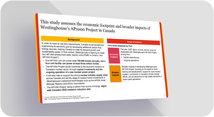 This study assesses the economic footprint and broader impacts of Westinghouse’s AP1000 Project in Canada Background Scope of analysis In order to meet its net-zero requirements, Canada would benefit from Core areas assessed by PwC augmenting its electricity grid by developing additional carbon-free The jobs, GDP, labour income, and tax revenue energy sources, helping Canada to meet its demand growth and associated with Westinghouse's AP1000 Project sustainability goals. In that context, Westinghouse is seeking to install arising from: Economic four AP1000 pressurized water reactor units (PWR) in Ontario (“the footprint • Capital expenditures AP1000 Project”). • Ongoing operations • One AP1000 unit can power over 750,000 homes annually, and a four unit facility can power at least three million homes. Broader impacts of developing Westinghouse's • The AP1000 Project would contribute to the economic footprint of AP1000 Project, focusing on its impact on skills, Canada’s nuclear sector through capital investments and the training and development, support for local industry ongoing operation of a new nuclear power project. Broader clusters, contribution to Canada's climate change • It will also help to support the strong nuclear industry supply chain impacts efforts, and its adherence to high safety standards in across Canada and set the stage to support future investments in power plant operations. Westinghouse’s advanced technologies such as the AP300 Small Modular Reactor and eVinci microreactor. • The AP1000 Project, being a carbon-free source of energy, aligns with Canada's 2030 emission reduction plan. Sources: Westinghouse, Environment and Climate Change Canada PwC | The Economic Impact of a Westinghouse AP1000 Reactor Project in Canada 5